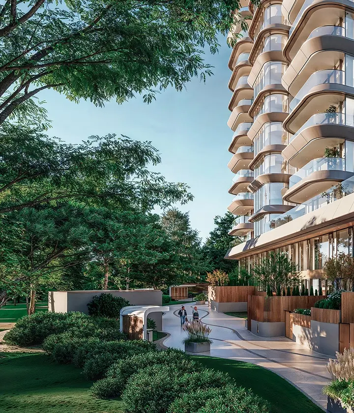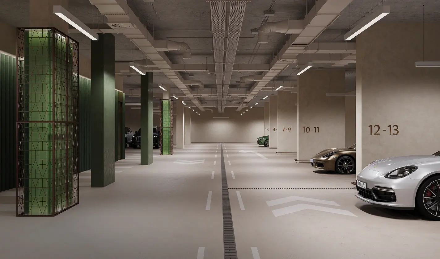 At Springs, everything has been marked by designer’s hand that turned utility spaces aesthetic objects. Our two-level designer car park is framed with a natural stone fence, its textures subtly accentuated by a chain of opalescent sconces. Encircled by trees and dramatic silhouettes of flowerbeds, this parking will make your car sparkle like a jewel meant for the opulent lifestyle.